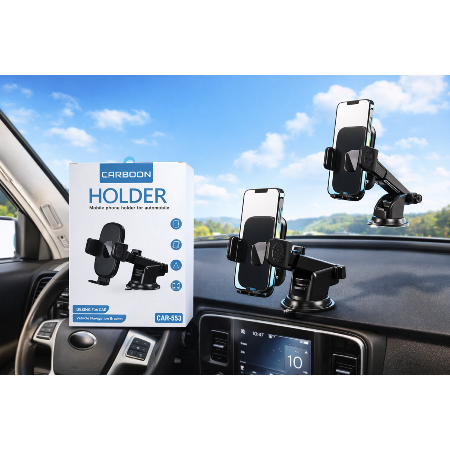 Sürüş sırasında telefon kullanımını güvenli ve pratik hale getirin! Carboon CAR-553 Araç İçi Telefon Tutucu, sağlam vakumlu yapısı ve ayarlanabilir kolları ile cihazınızı sabit tutar, güvenli bir sürüş deneyimi sunar.
